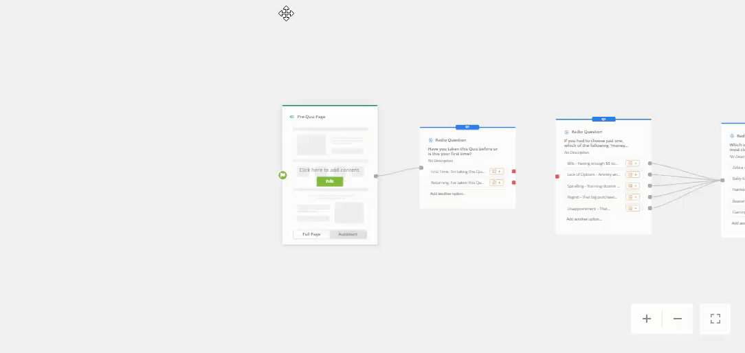 New questions added to a quiz will have a default configuration, where adding the title, choices, and mapping are needed. Additionally, these new questions can be located between existing questions.