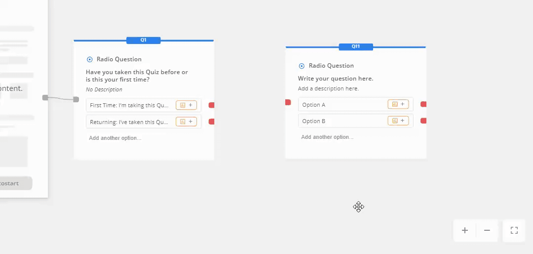 Hover over the lines that connect the questions and click on the trash can icon to remove the connections. Red dots will display upon deleting the connection successfully.