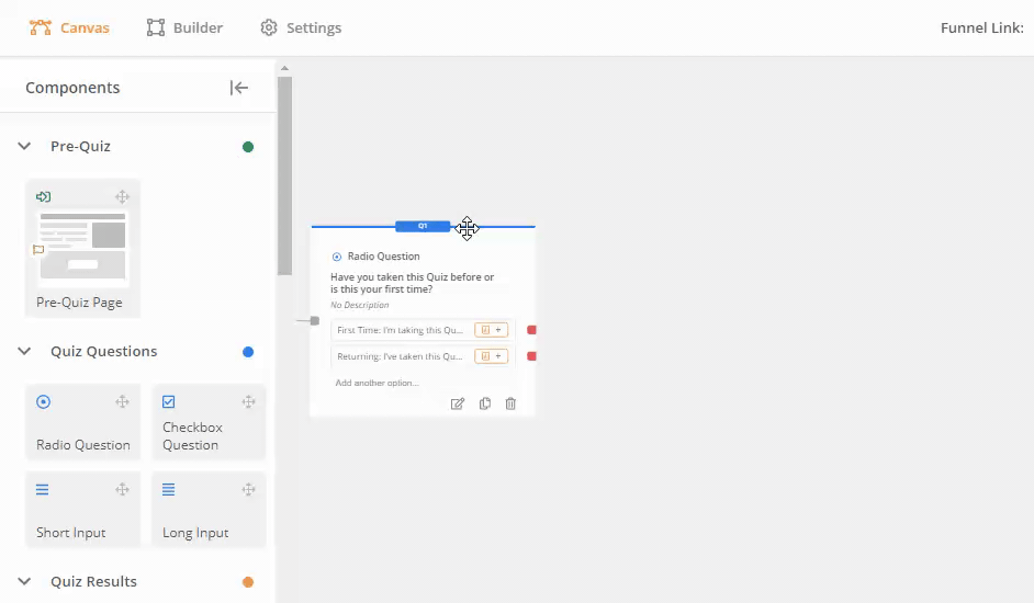On the Canvas, drag the new Quiz Question component, and locate it in the space left between the existing questions.