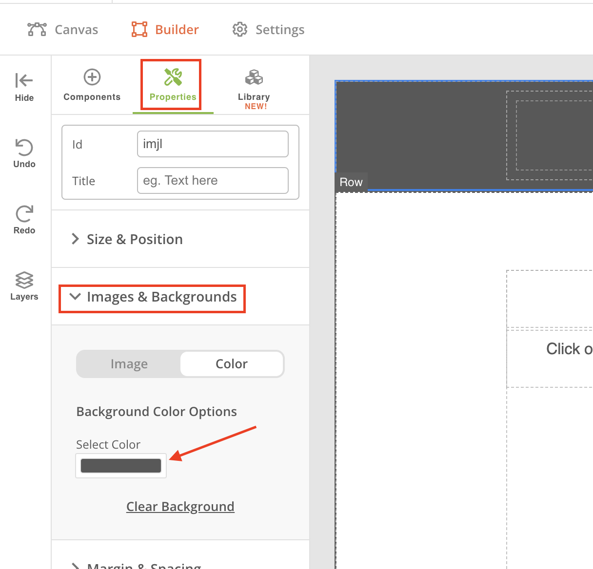 Click the Properties tab of the Builder, then scroll down to the Image and Background section, then click on the Select color option.