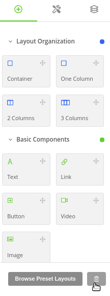 Regardless of whether you started from scratch using an empty page or you’re using a preset layout, if you’re not happy with how your Post-Quiz Page looks, you can delete the components already on the page by clicking the button with the trash icon on the bottom right of the Components sidebar.