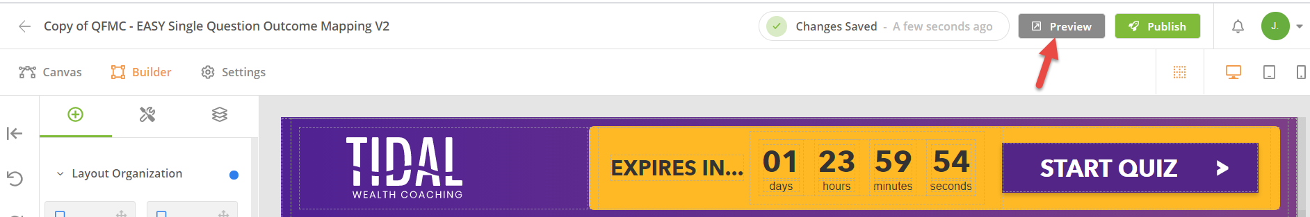 Whether we are in Canvas, Builder, or Settings, the Preview button will always appear at the top-right corner of the page, and is a gray-colored button.