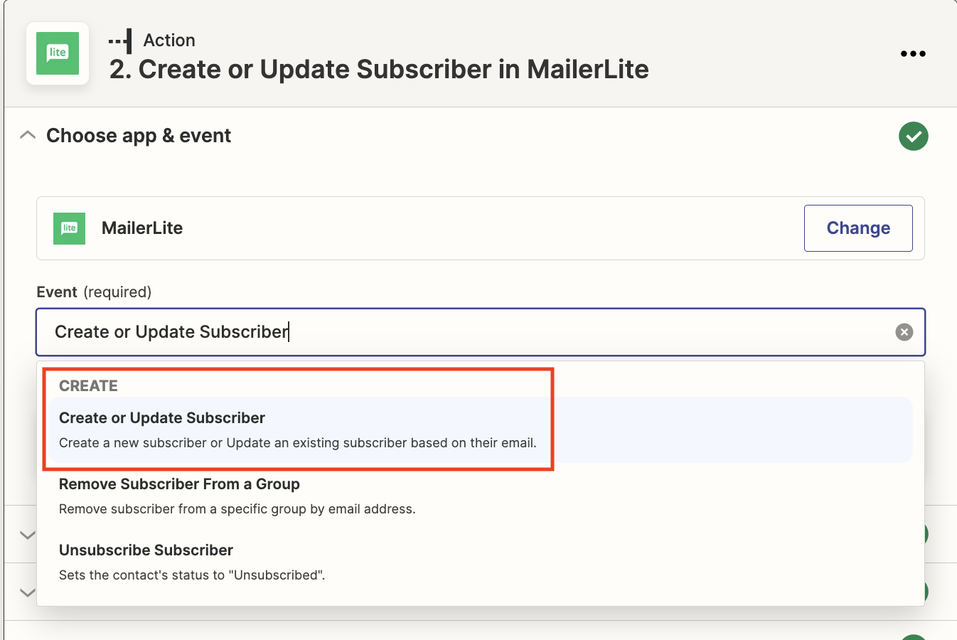 - From the Choose App & Event search box type MailerLite, make sure you don’t select “classic”
