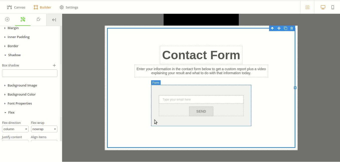 The Flex properties are related to the Flexbox layout model that is used for the components in your Lead Capture page. These properties vary depending on the component. Viewable by default, you can hide this section of the Builder by clicking the button to its left. It is recommended to stick with the default properties unless you’re familiar with web design.
