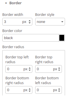 The border properties lets you specify the style, width, and color of the border around the component. Viewable by default, you can hide this section of the Builder by clicking the button to its left. Typically, when creating your page, these are set for you when you drag the component to the Builder. However, you have full control over the border.