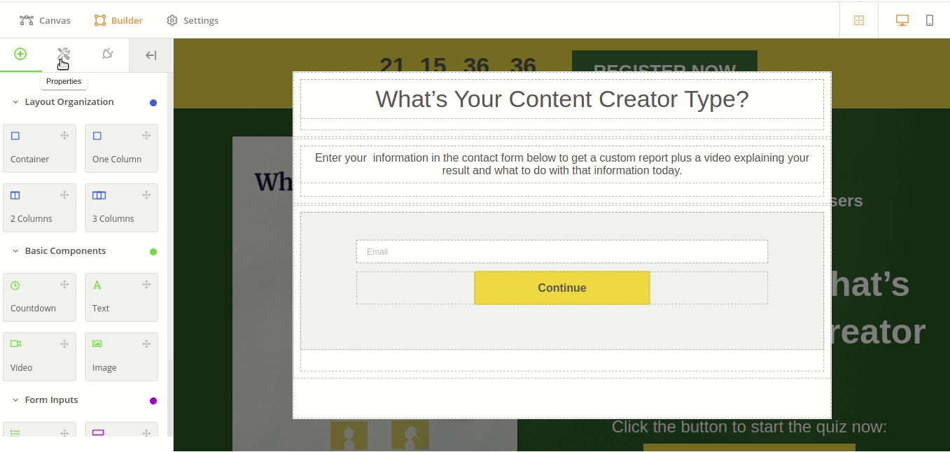 After laying out your Lead Capture page using the various Lead Capture components (see our article on Lead Capture Page Builder: Components), you can set the properties of the components and customize them further from the Properties tab, which is located to the right of the Components tab on the Builder.