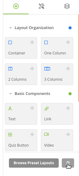 To use a preset layout in your Pre-Quiz page, click the Browse Preset Layouts button on the bottom of the Components sidebar, then select from the list of available layouts.
