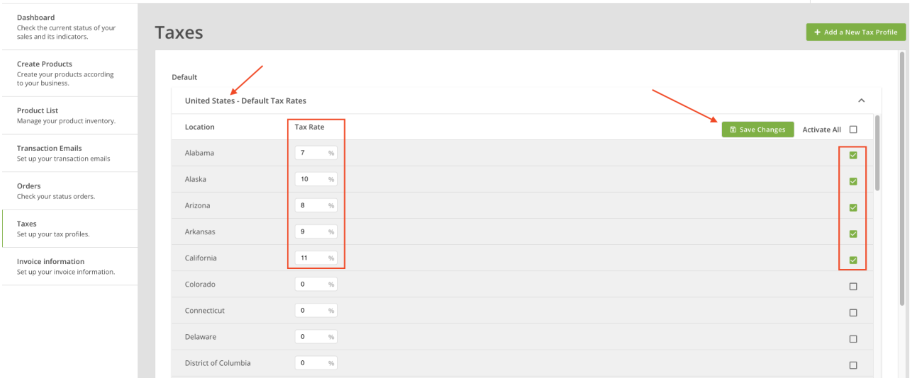 Finish the tax configuration by enabling the location using the check box next to each state and clicking Save Changes.